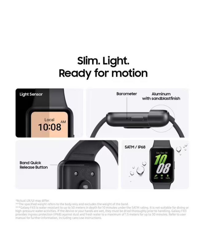 - What’s in the box: 1x Samsung Galaxy Fit3 Fitness Watch in Black, Charging Cable (Micro USB) and User Manual.